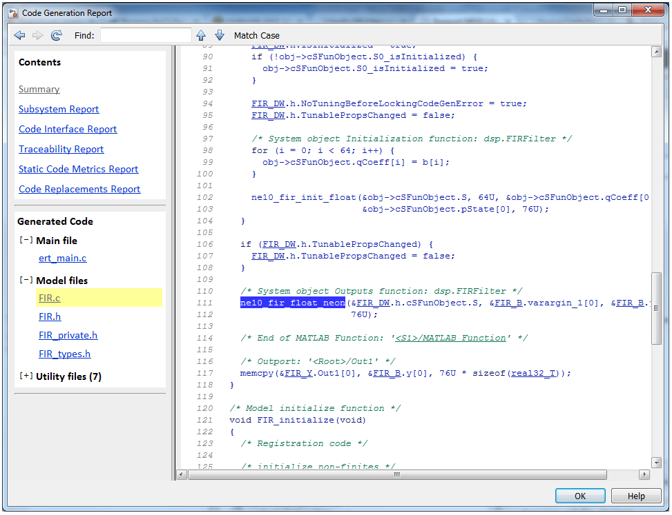 2. In the code generation report, click on the FIR.c file. Notice the NE10 functions, ne10_fir_init_float and ne10_fir_float_neon in the model's step function, FIR_step.