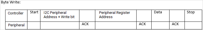 The following image shows a single byte read and write on an I2C peripheral devices.