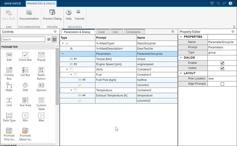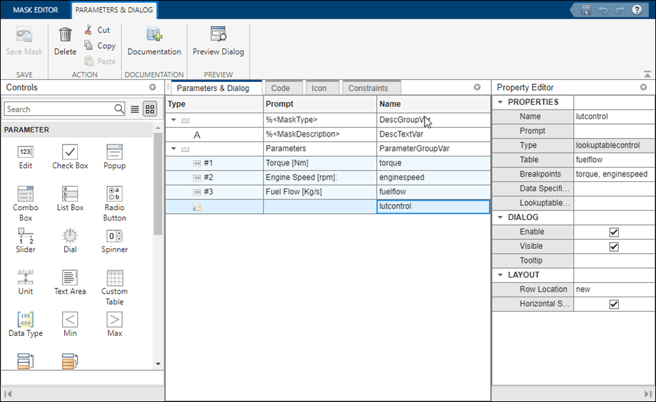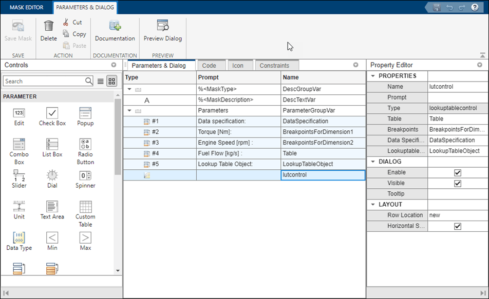1. Right-click the block LUT Control with Explicit Data, click Edit Mask to open the Mask Editor. In the Mask Editor, go to the Parameters & Dialog pane and create Edit parameters Torque and Engine Speed for breakpoints. In the Property Editor pane, enter the values for the breakpoints in the Values field.