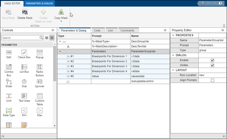 Use a lookup table to evaluate a sampled representation of a function using simple lookup operations. It enables you to assess the function with less computation time than running the function. You can visualize, edit, and plot N-dimensional lookup table data in mask dialog box using the lookup table control.