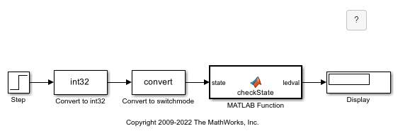 Open the MATLAB Function block. The function checkState uses enumerations to activate an LED display based on the state of a device. The function lights a green LED display to indicate the ON state and a red LED display to indicate the OFF state.