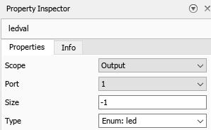 When using enumerations for outputs, you must explicitly refer to the enumeration class definition in the Type property of the variable. Click either of the variable names to view the properties in the Property Inspector. In this example, the Type property for state is Inherit: Same as Simulink. The Type property for ledval is Enum: led.