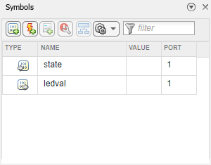 In the Function tab, click Edit Data to view the enumerated inputs and outputs specified in the MATLAB Function block. The Symbols pane displays the input state and the output ledval.