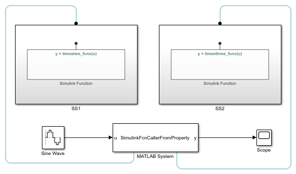 The MATLAB System block calls one of the Simulink functions inside two different subsystems, depending on the value of the signal coming from the Sine Wave block. If the value of the signal is less than 10, the MATLAB System block calls the timestwo_func Simulink Function inside the SS1 subsystem. If the value is larger than 10, it calls the timesthree_func in the SS2 subsystem.