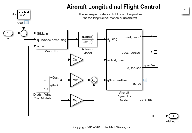 The example model represents the flight control algorithm for the longitudinal flight of an aircraft.