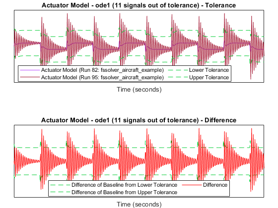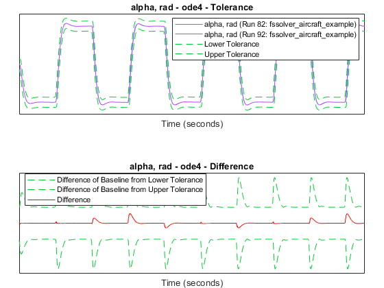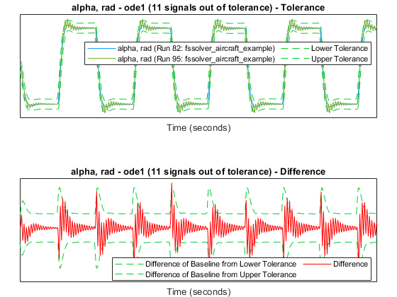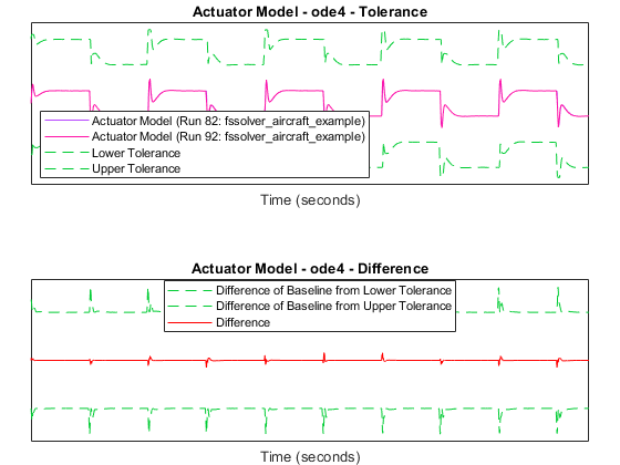 The comparison plots display the results for the lowest order fixed-step solver simulation where all signals fell within tolerance, when compared to the baseline variable-step simulation. For the selected solver, comparison results of a few of the signals are plotted below.