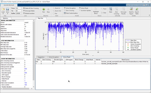 For this specific example, set the fixed-step size of the solver to 0.1 (the maximum step size detected by the Solver Profiler). This takes into account the discrete sample time 0.1 of the Dryden Wind-Gust block, as well as the periodic nature of the stick movements and the aircraft response.