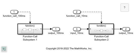 At the top level of an export-function model, functions are modeled within Function-Call Subsystem, function-call Model, Simulink Function, and S-Function blocks. This example uses Function-Call Subsystem blocks to model two functions.