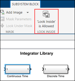 To hide the implementation details of the Subsystem block Continuous Time, select the Subsystem block. In the Simulink Toolstrip, on the Subsystem Block tab, in the Look Inside section, click 'Look Inside' is Allowed. This will disable the option to view the implementation details of the Subsystem block, through the user interface and programmatically by using open_system(blk,"force"), where blk is the full name or path of the Subsystem block in the open or loaded model.