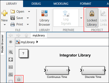 In the Library tab of the Simulink Toolstrip, in the Protect section, click Locked Library.