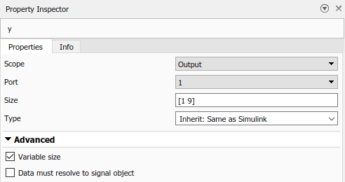 Both u and y are variable size. You do not need to explicitly define u as variable size, because u is an input. The output y is declared as a variable-size vector because the number of elements varies depending on the size provided by u. Inspect the properties of y to confirm that it is variable size.