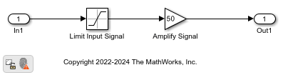 The subsystem slexReusableSS limits the input between (-10,10) and then amplifies the result by a factor of 50. slexReusableSS has two test harnesses, ssref1_double and ssref1_int32. To accommodate data between (-500,500), ssref1_double and ssref1_int32 use double and int32 data types, respectively.