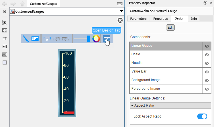 On the Gauge tab, click Edit. A toolbar appears above the Vertical Gauge block.