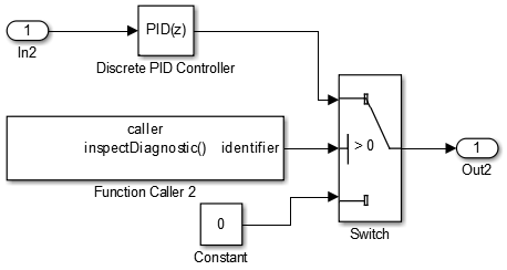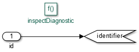 The implementation of the function (Simulink Function) uses a graphical input (id) to observe the last reported diagnostic and transfer this value as an output argument (identifier) to the caller. A graphical input is a server-side signal that is not part of the server interface.