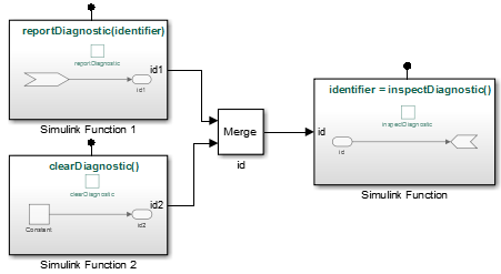 Use Simulink® functions when you define a diagnostic service where callers pass an error code. The service tracks error codes for all errors that occur. One way to implement this service is to use an indexed Data Store Memory block. A diagnostic monitoring system can then periodically check for the occurrence of specific errors and modify system behavior accordingly.