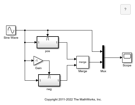 Consider a model that uses two Enabled Subsystem blocks and a Merge block to model a full-wave rectifier, which is a device that converts AC current to pulsating DC current.
