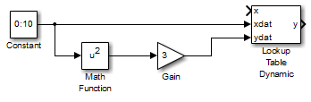 Block Parameter Value Constant Constant value 0:10Math Function Function squareGain Gain 3Input the breakpoint vector to the Lookup Table Dynamic block by connecting the output port of the Constant block to the input port labeled xdat of the Lookup Table Dynamic block. This signal is the input breakpoint vector for x.