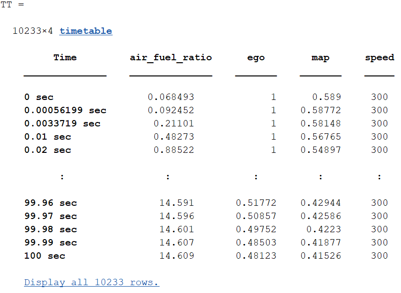 For this example, first load the timetable data to the workspace. The dTimeTableData.mat file contains timetable data for the air_fuel_ratio, ego, map, and speed signals in a model that represents a fuel control system for a gasoline engine. For more information about the model, see Model Fault-Tolerant Fuel Control System.