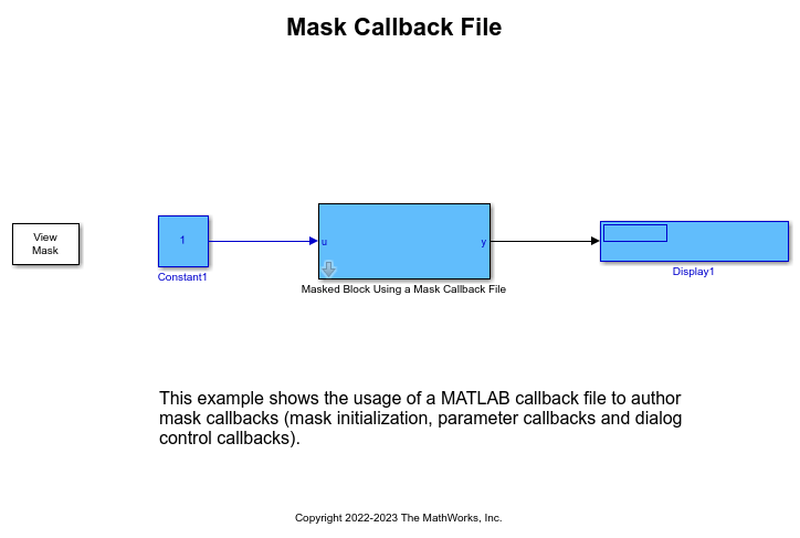 To view the mask initialization written for this example, right-click Masked Block Using a Mask Callback File. In the context menu, click Mask > Edit Mask. On the Code tab, the mask_cb_file_example file contains the initialization and callback code for the model.