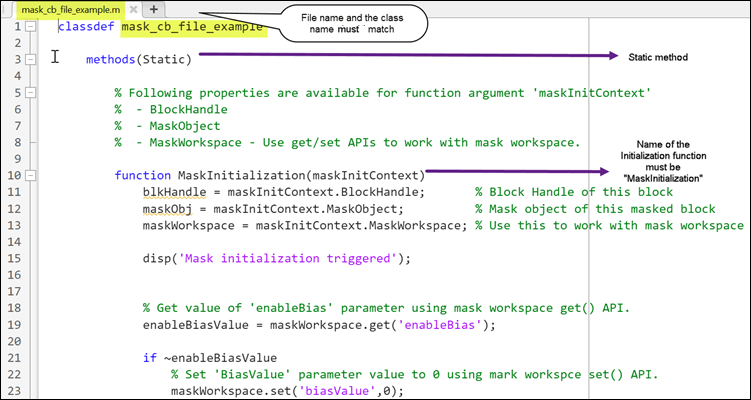 You can organize mask initialization and callback code in a single MATLAB file. The name of the callback file and the name of the class that the function belongs to must be the same. For example, if the name of the callback file is mask_cb_file_example then the name of the class file must be mask_cb_file_example. The MATLAB file must be located in the MATLAB path.