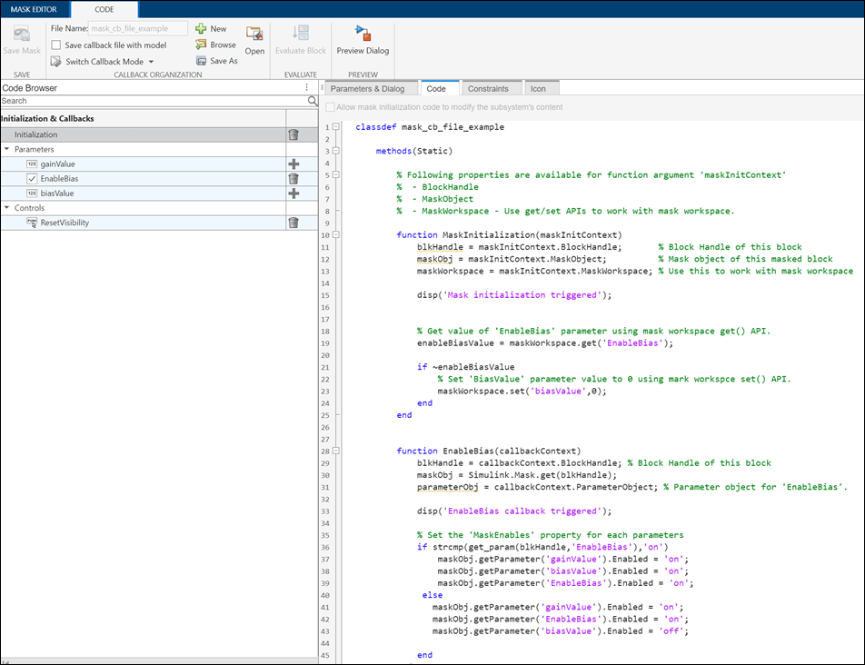 Note: If you want to store the mask callback in the mask object rather than in a separate MATLAB file, go to Mask Editor, click Code > Switch Callback Mode > select Mask.