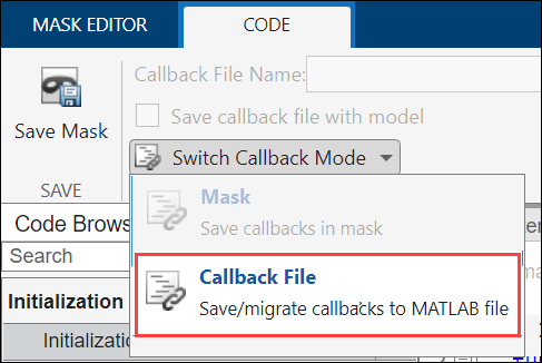 To migrate the existing callback code, right-click the masked block, from the context menu select Mask > Edit Mask. In the Code tab, click Switch Callback Mode and select Callback File.