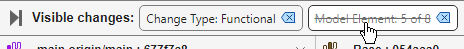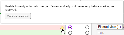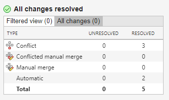 • If you resolved all conflicts in the current view but the summary table title is x unresolved changes of which y are filtered, you must disable the filters to view and resolve the remaining conflicts. To clear all applied filters, click the filters next to Visible changes.