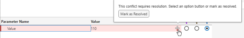 If you want to keep the change from the main branch, select the option button in the main branch instead. When you make a selection, the tool automatically marks the item as resolved and updates the row color.