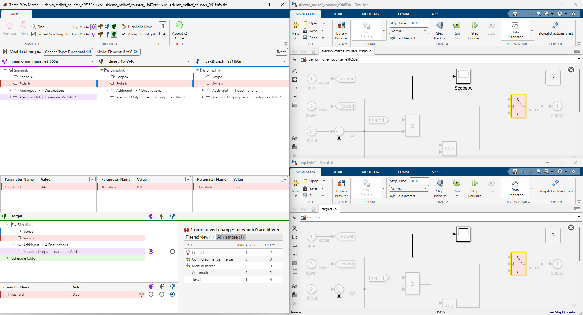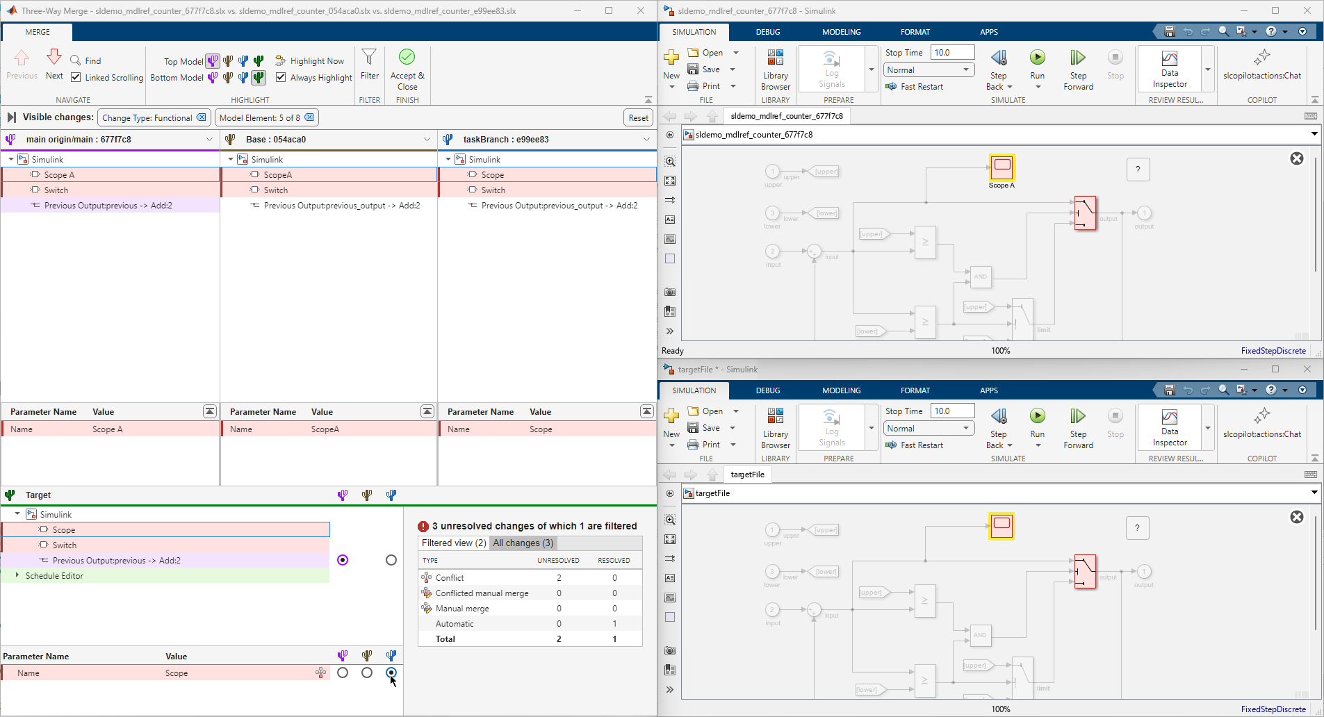 In this example, to resolve conflicts in your model files, resolve conflicts in the sldemo_mdlref_counter.slx model before you resolve the conflicts in the sldemo_mdlref_basic.slx model.