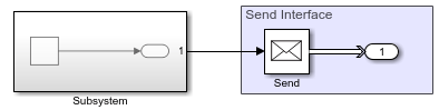 To prepare the Send Component for message-based communication, a Send block is connected to the root-level Outport block. The Send block converts data signals and send messages.