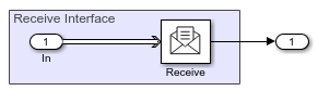 To prepare the Receive Component, the Inport block is connected to a Receive block. The Receive block receives messages and converts them to signal data. By default, the Sample time parameter of the Receive block is -1.