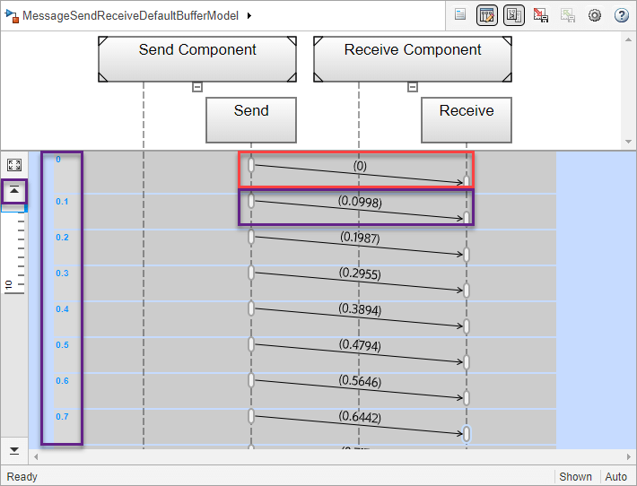 The Sequence Viewer block window shows the simulation time in the left vertical bar. Each time grid row contains events that occur at the same simulation time. Each message transition event is represented by an arrow that is labeled with the message data value. For more information about the Sequence Viewer block, see Use the Sequence Viewer to Visualize Messages, Events, and Entities.