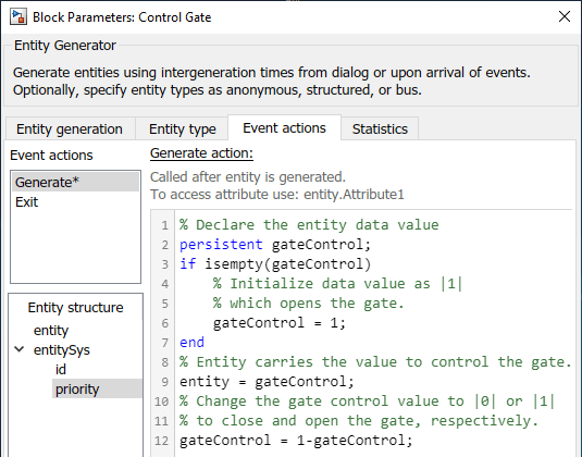 In the Control Gate block, in Event actions, in the Generate action field, the code below is used to generate entities to open and close the Gate block. Initially, entity data is 1 and the gate is open and the channel is in operational state. When a new entity is generated, its value changes to 0, which closes the gate. Every generated entity changes the status of the gate from open to closed or from closed to open.