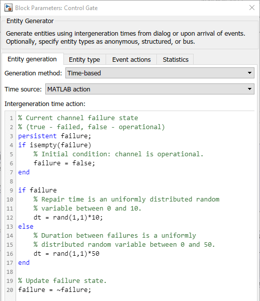In the Control Gate block, in the Intergeneration time action field, the code below is used to represent the operational and failed state of the channel. The code initializes the channel as operational. dt is the entity intergeneration time and is used to change the status of channel because each generated entity changes the status of the Gate block.