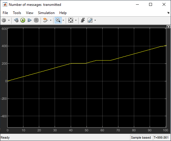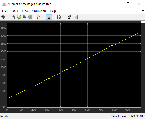 Open the Scope block connected top the Transmission Buffer block. The block displays the total number of messages transmitted through the shared channel.