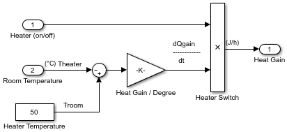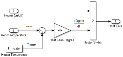 To model the heater subsystem, model the rate of heat gain equation with Simulink blocks: