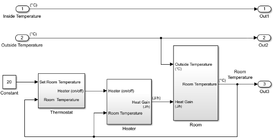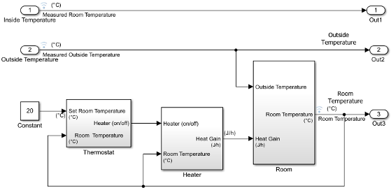 Location of signal Signal name Outside Temperature from output port 2. Measured Outside TemperatureRoom Temperature from Room subsystem output port Room Temperature