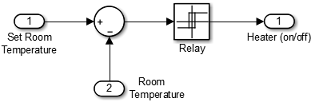 Model a Heater Switch. The thermostat sends an on/off signal equal to 1 (on) or 0 (off) to the heater. Because the input signal is binary, you can use a Product block to model a switch.
