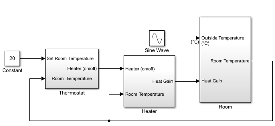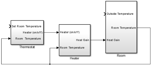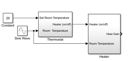 At the top level of the house heating model, use Subsystem blocks to organize your model and create the structure. The model includes the subsystems Thermostat, Heater, and Room.