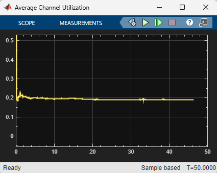 Simulate the model and open the Scope block that displays the average channel utilization. The channel utilization converges to approximately 0.12.