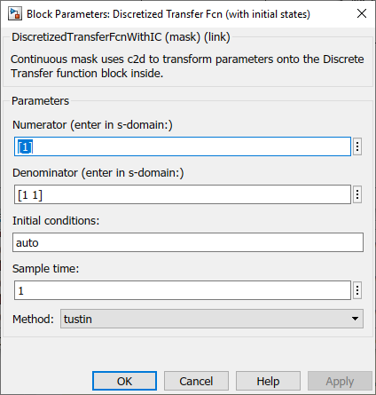 Discrete blocks (Enter parameters in s-domain). Creates a discrete block whose parameters are retained from the corresponding continuous block. The sample time and the discretization parameters are also on the block's parameter dialog box.