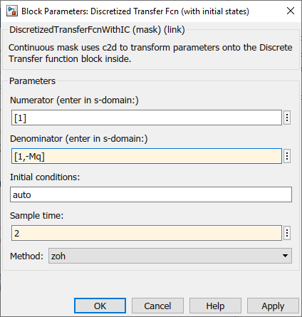 zohfrom the Method dropdown list.The parameter dialog box for the Discretized Transfer Fcn now looks like this.