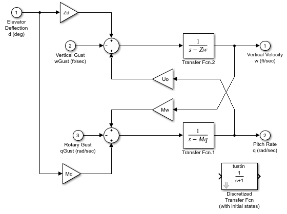 The procedure below shows how to replace a continuous Transfer Fcn block in the Aircraft Dynamics Model subsystem of the f14 model with a discretized Transfer Fcn block from the Discretizing Library. The block is discretized in the s-domain with a zero-order hold transform method and a two second sample time.