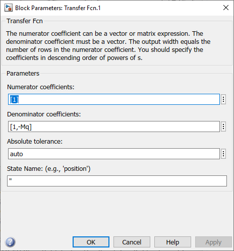 Open the parameter dialog box for the Transfer Fcn.1 block.