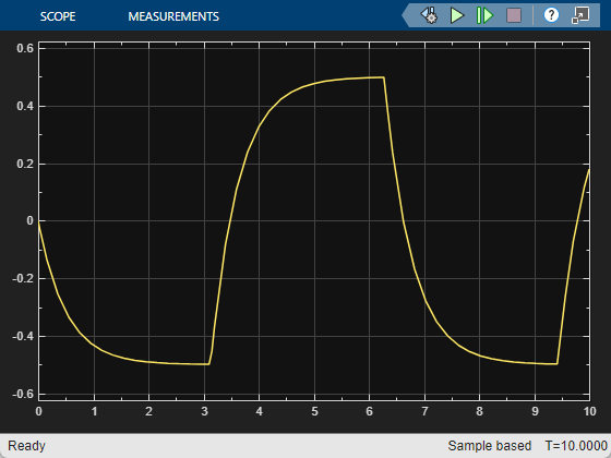The Scope displays x at each time step. For a simulation lasting 10 seconds, the output looks like this:
