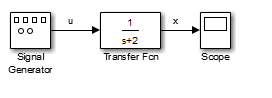 The equation you modeled in this example can also be expressed as a transfer function. The model uses the Transfer Fcn block, which accepts u as input and outputs x. So, the block implements x/u. If you substitute sx for x´ in the above equation, you get