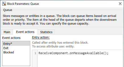To achieve this behavior, in the Queue block, in the Event action tab, in the Entry field, the block calls the Simulink Function onMessageAvailable(). See Event Action Languages and Random Number Generation (SimEvents) for more information on Event Actions.