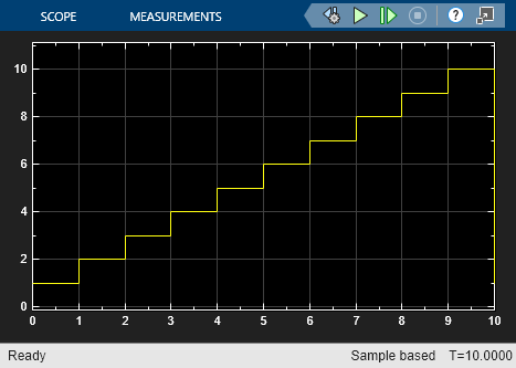 Open the model and run the simulation to see the original scope output. The simulation runs for 10 time steps, stepping up by one at each time step.
