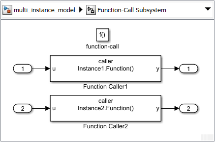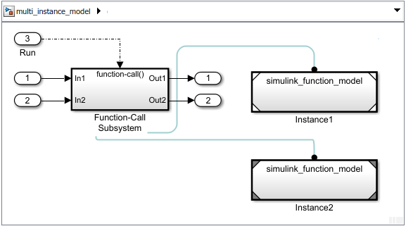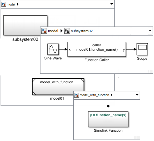 scoped.Reference the model with Simulink functions from multiple Model blocks. Add a Function-Call Subsystem block to schedule calls to the functions.
