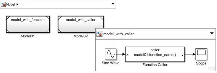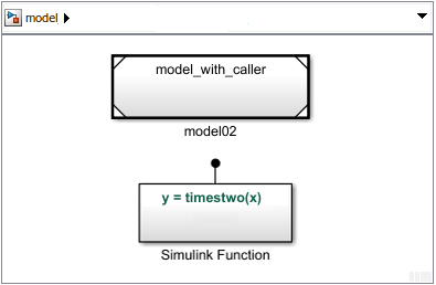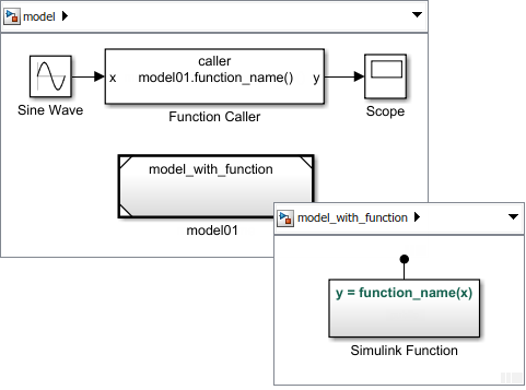 When you place a Simulink Function block in a Model block, the function name is not accessible outside the model. However, you can call a function by qualifying the function name with the Model block name. When a function caller resolves to a qualified function hierarchically, it looks for the Model block containing the function using the following rules:
